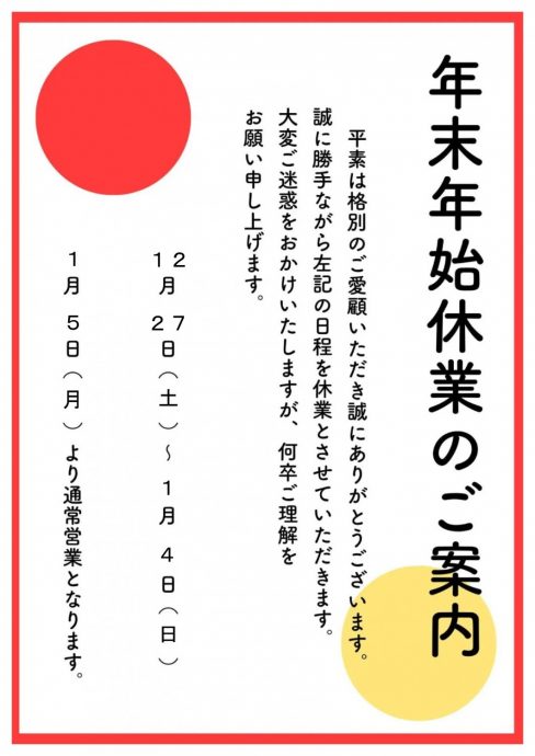 [ 年末年始休業期間 ]12月27日(土)~1月4日(日)
