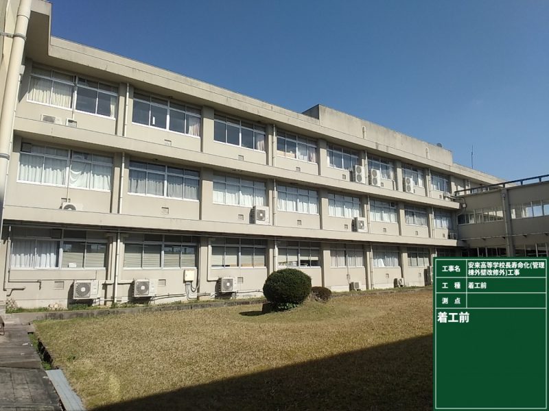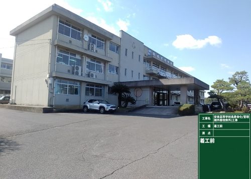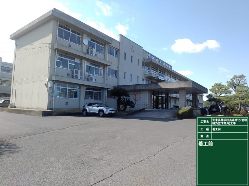 工事位置/安来市佐久保町地内 発注者/島根県東部県民センター 工事期間/令和7年2月~令和7年12月 工事概要/安来高等学校 管理棟 RC造 3階建て 東渡り廊下棟 RC造 2階建て 西渡り廊下棟 RC造 2階建て 外壁改修工事 一式 防水改修工事 一式